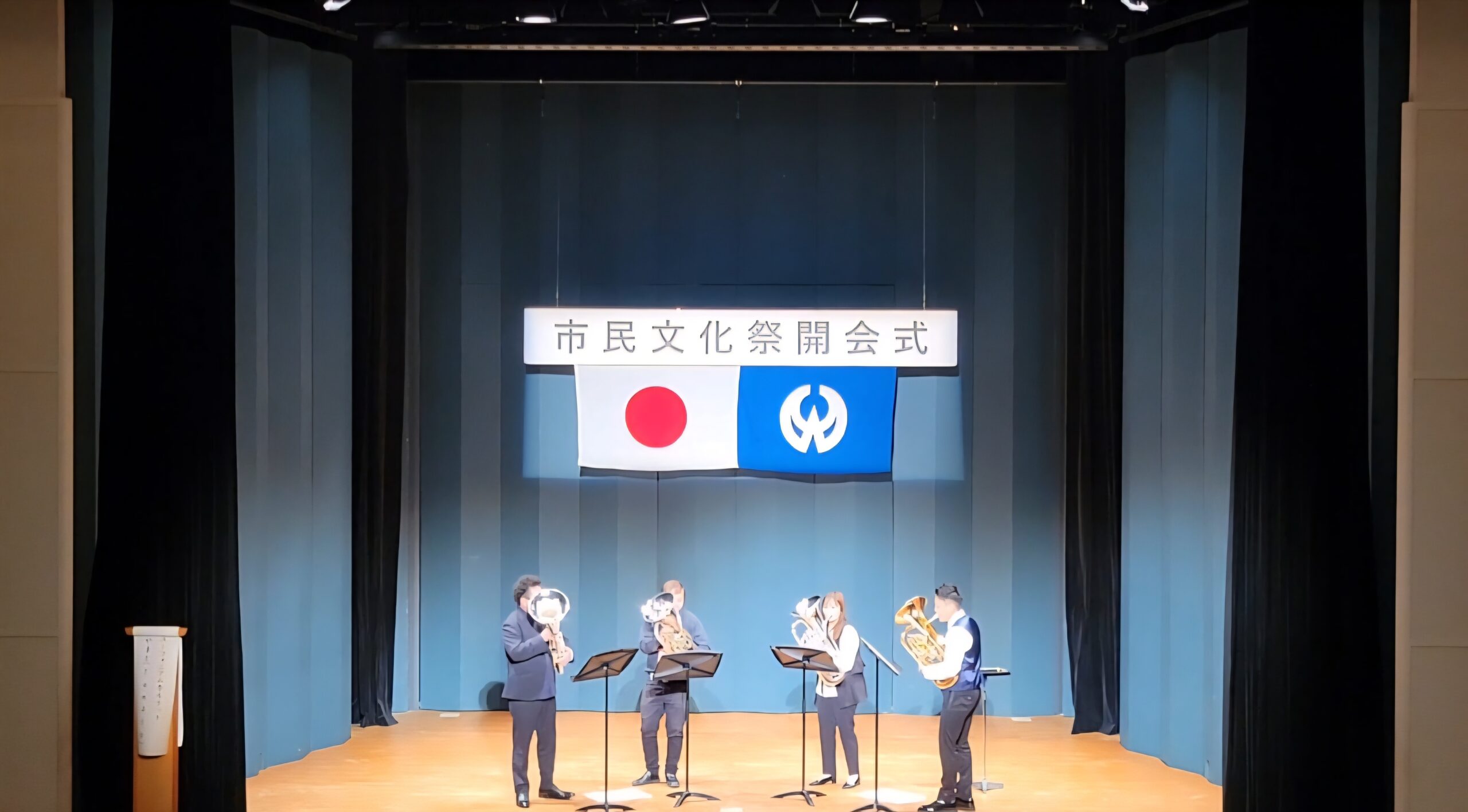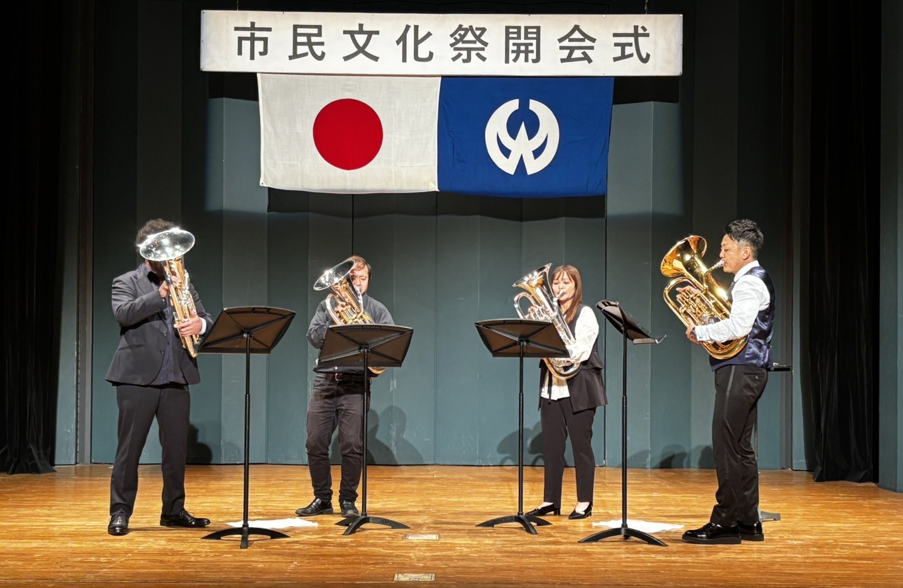 開会式では、式典のほか、アトラクションが行われ、友好姉妹都市の喜多方市からオカリナと太極拳の演奏・演舞と、東大和にゆかりのあるユーフォニアムの四重奏の演奏が華を添えました。ユーフォニアム演奏においては、ホールから市内の音楽家をご紹介し、その関係からマネージャーも演奏者の一人として参加し、微力ながらお手伝いさせていただきました。